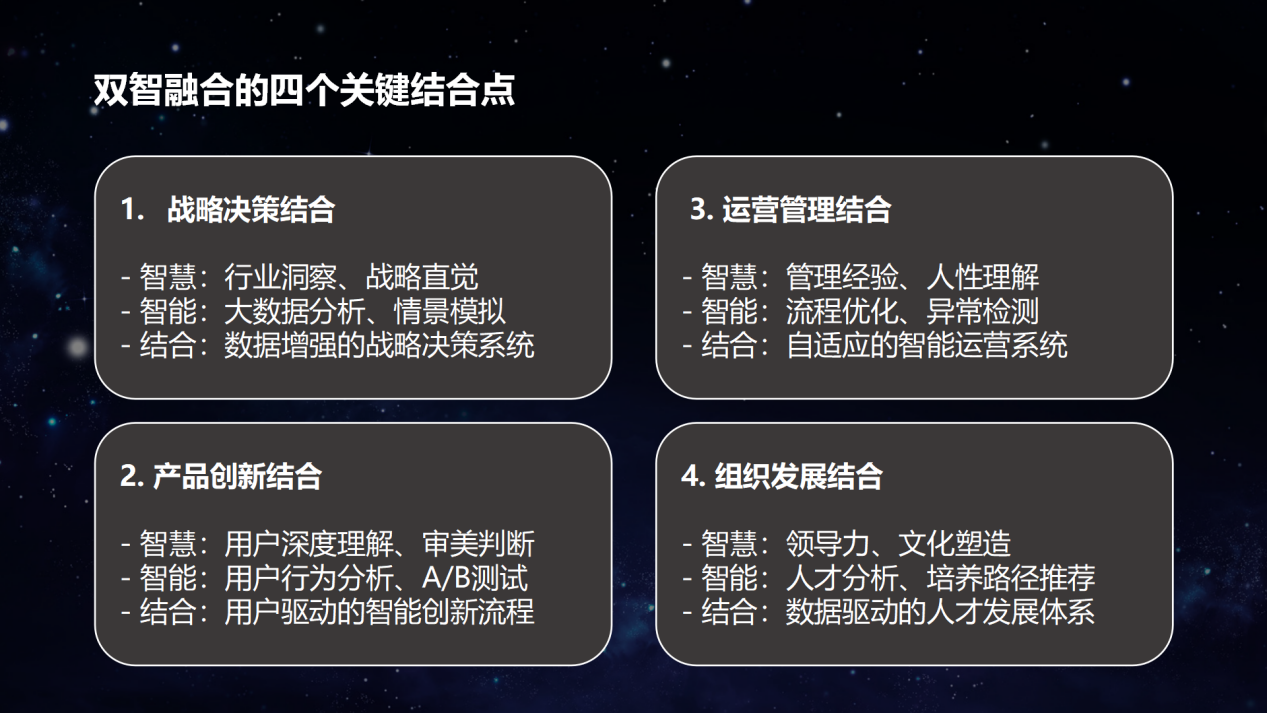 实践中,智能与智慧的结合体现在四个关键领域: