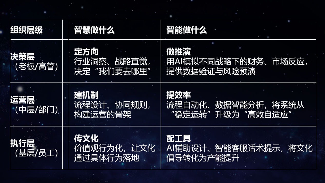 在运营层:用智慧建系统,用智能提效率。管理者依靠经验构建的流程与机制,是运营的骨架。智能技术嵌入其中实现流程自动化、实时监控与智能预警,将系统从“稳定运转”升级为“高效自适应”。
