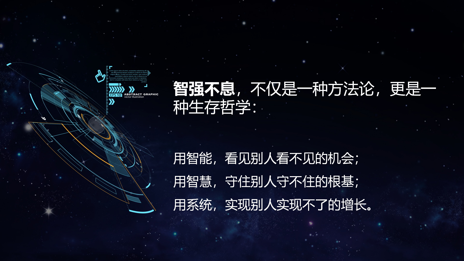 用智能,看见别人看不见的机会;用智慧,守住别人守不住的根基;用系统,实现别人实现不了的增长。