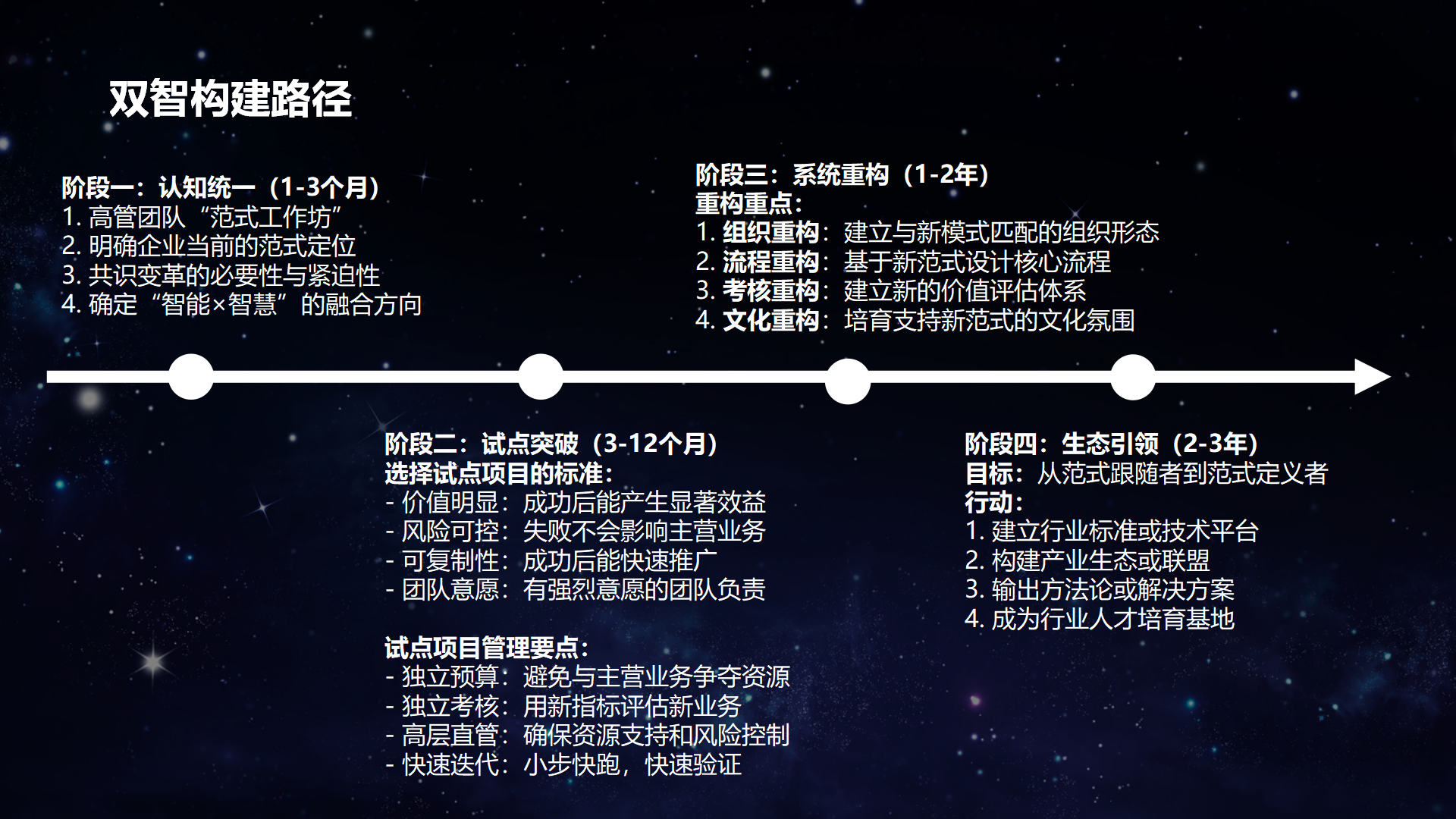 第一阶段:认知统一(1-3个月)。核心是高管团队达成共识。通过“范式工作坊”等形式,理解趋势,诊断现状,确立双智融合的顶层方向。