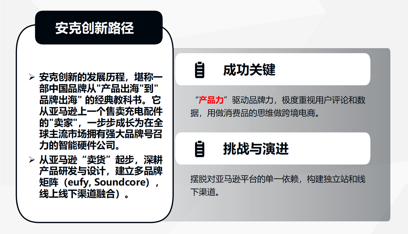 ● 贸易先行模式(如安克创新):揭示了如何从平台卖家起步,通过极致产品力、多品牌矩阵与全渠道建设,完成从“卖货”到“品牌”的跃迁,其核心在于 “产品驱动品牌” 的长期主义。